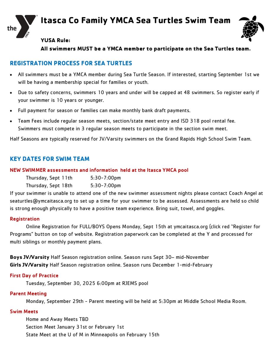 Sea Turtles swim team practices at the Robert J Elkington Middle School. Due to the size restrictions, no diving and 5 lanes at the YMCA pool, we rent the from ISD 318 to use the middle school pool. ISD 318 rental fees are included in the cost of our program.